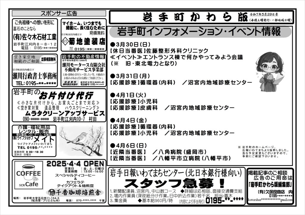 今号も、石材店、塗装店、不動産、行政書士事務所、片付け代行、カフェ、新聞販売店など、多くの地域事業者様にご協力いただいております。
